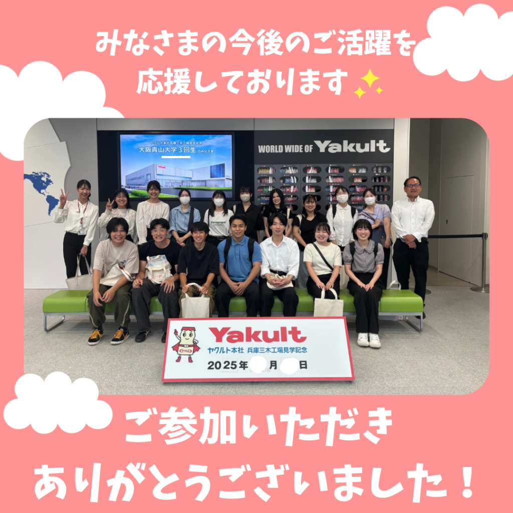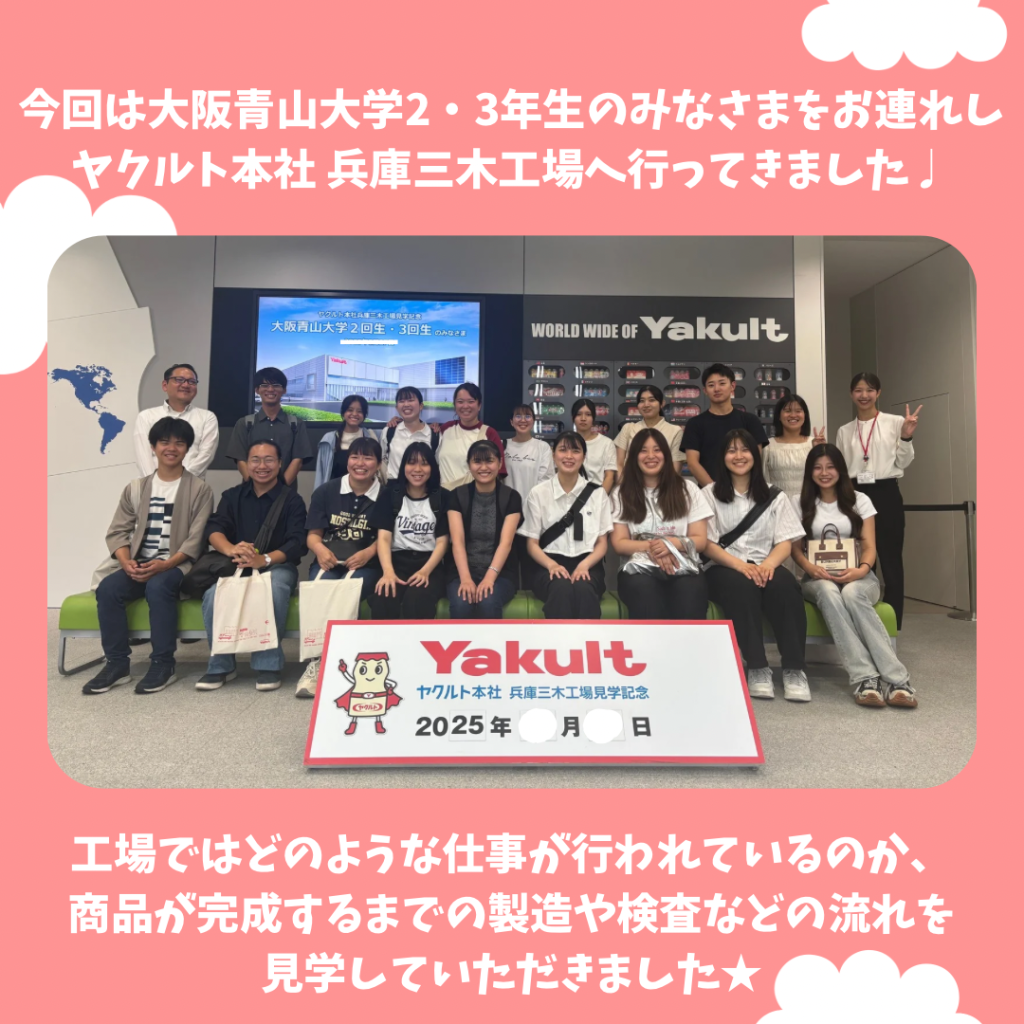 先日、大阪青山大学 健康栄養学科2・3年生のみなさまと一緒にヤクルト本社 兵庫三木工場へ行ってきた様子をご紹介🏭!