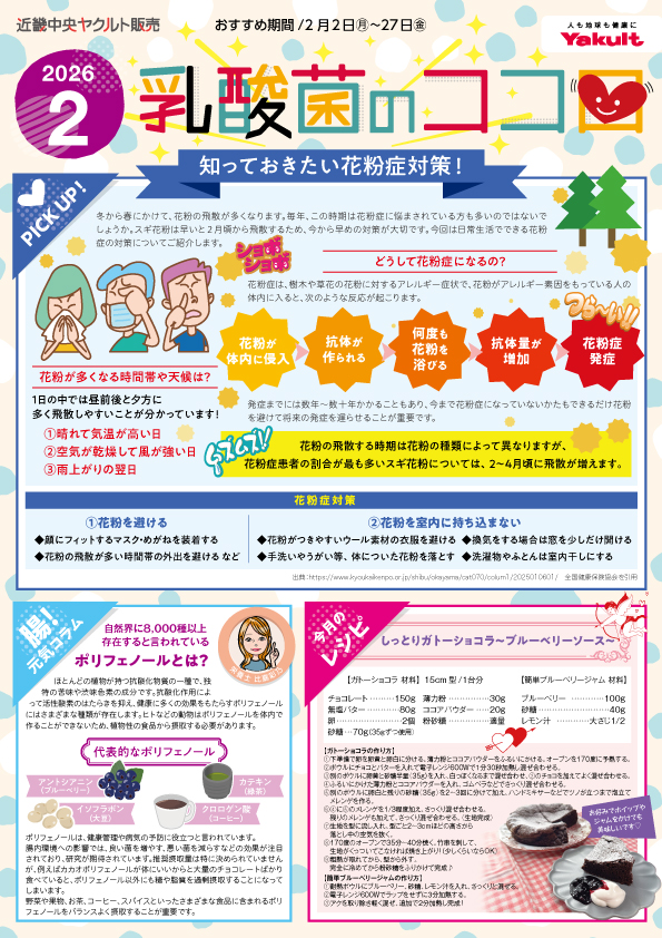 - 特集 / 花粉症対策 腸!元気コラム / ポリフェノールとは? 今月のレシピ / しっとりガトーショコラ