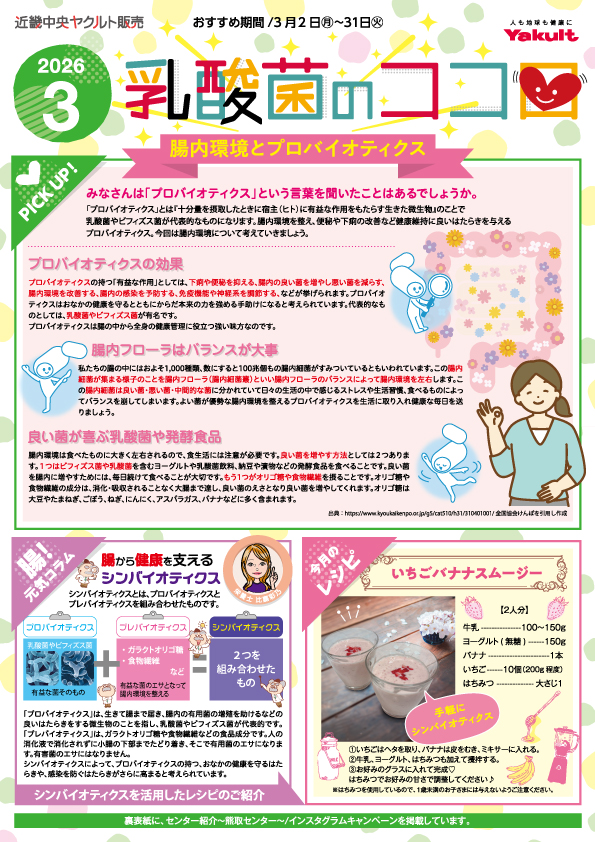 - 特集 / 腸内環境とプロバイオティクス 腸!元気コラム / 腸から健康を支えるシンバイオティクス 今月のレシピ / いちごバナナスムージー